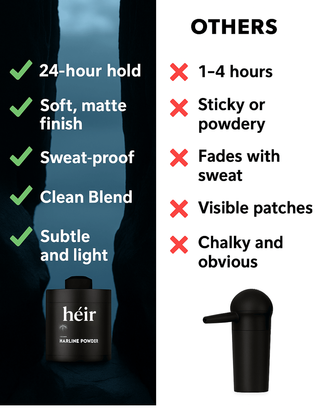 héir’s lightweight, matte-finish powder blends seamlessly with your natural hair for instant, fuller-looking coverage. It features a premium built-in sponge applicator for quick, mess-free touch-ups anytime, anywhere. Sweat-proof, smudge-resistant, and designed for daily confidence.